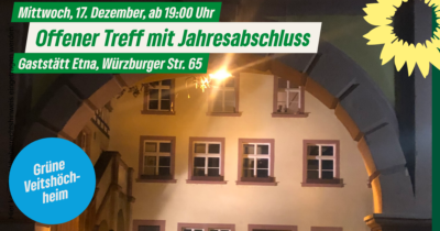 Offener Treff mit Jahresabschluss Restaurant Etna, Würzburger Str. 65 Nachdem wir zwei Monate wegen Vorstandswahl und Aufstellungsversammlung „fremdgegangen“ sind, treffen wir uns im Dezember wieder im Etna. Herzlich eingeladen sind…