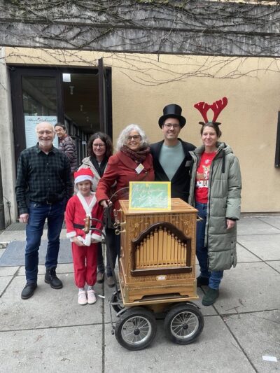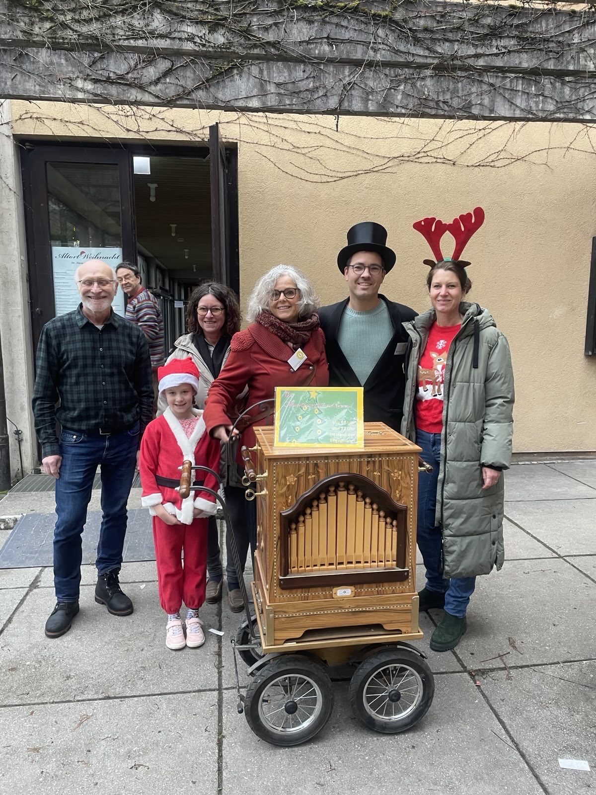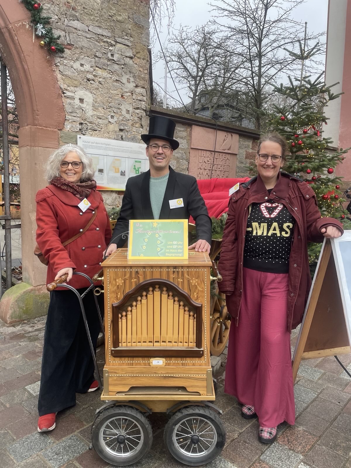 Ein weiteres Highlight war eine Drehorgel (Leierkasten), der die drei Spitzenkandidaten für die Kommunalwahl, Christina Feiler, Martin Husch und Sissi Baudach drei Stunden lang begeistert Lieder entlockten. Die Gäste des Weihnachtsmarktes wurden so schon gleich beim Kommen begrüßt und kaum jemand konnte sich der Drehorgel entziehen.